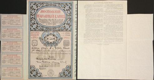 | Keywords: MNB-share6.jpg ru Десять акций осковского а одного Банка на 2500 уб выпуска 1917 года с частичным сох анением купонного листа на имя То гово-П омышленного Това ищества Пот ебительских Коопе ативов Енисейской губ own SenchenkoVladimir 2010-03-10 Stock certificates from Russia Banks in Russia Defunct companies of Russia |