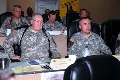 | Keywords: MNC-I leadership visits 1st ACB DVIDS42944.jpg en Newport Ark native Maj Gen James Simmons left the deputy commanding general for the Multi-National Corps Iraq listens as Traverse City Mich native Col Dan Shanahan right commander of the 1st Air Cavalry Warrior Brigade 1st Cavalry Division explains the 1st ACB's mission in Iraq during a briefing at the Warrior headquarters in Camp Taji Iraq Simmons visited the 1st ACB from April 29 to May 1 2007-05-01 Staff Sgt Nathan Hoskins https //www dvidshub net/image/42944 42944 2007-05-01 11 54 TAJI IQ PD-USGov 1st Cavalry Division United States Camp Taji Images from DoD uploaded by FĂŚ |