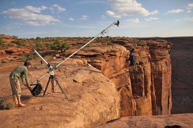 Keywords: moab utah mountains film crew men filming scenic high wire man balancing landscape nature outside sky clouds