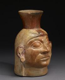| Keywords: Moche - Portrait Vessel - Walters 482827 - Three Quarter.jpg The peoples of America before Columbus rarely made portraits of historical individuals rather they created more general representations The great majority of these were created in two cultural traditions the Maya of Mexico and Central America and the Moche or Mochica of South America who were contemporaries though they were not in contact Although the Moche also excelled in gold and copper work perhaps their best-known works are ceramic vessels such as this mold-formed example which has hand-modeled details We do not know what was stored in these vessels; some appear to have been made for the tomb whereas other shattered examples have been recovered in ancient trash dumps They are likely images of famous potentates or warriors some are depicted in martial attire and were used in rituals AD 50-800 Early Intermediate-Middle Horizon red orange and gray earthenware cm 20 96 16 51 13 97 accession number 48 2827 79368 Dr Ernest Lira Houston and Denver or Dr Peter Almendariz Denver or M Brenner Geneva Paul Shepard Tucson Arizona date and mode of acquisition unknown Economos Works of Art Santa Fe New Mexico date and mode of acquisition unknown Private collection 1988 by purchase Walters Art Museum Anonymous gift 2009 place of origin Peru Walters Art Museum license Moche pottery in the Walters Art Museum Huacos retratos |