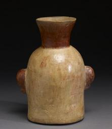 | Keywords: Moche - Portrait Vessel - Walters 482827 - Back.jpg The peoples of America before Columbus rarely made portraits of historical individuals rather they created more general representations The great majority of these were created in two cultural traditions the Maya of Mexico and Central America and the Moche or Mochica of South America who were contemporaries though they were not in contact Although the Moche also excelled in gold and copper work perhaps their best-known works are ceramic vessels such as this mold-formed example which has hand-modeled details We do not know what was stored in these vessels; some appear to have been made for the tomb whereas other shattered examples have been recovered in ancient trash dumps They are likely images of famous potentates or warriors some are depicted in martial attire and were used in rituals AD 50-800 Early Intermediate-Middle Horizon red orange and gray earthenware cm 20 96 16 51 13 97 accession number 48 2827 79368 Dr Ernest Lira Houston and Denver or Dr Peter Almendariz Denver or M Brenner Geneva Paul Shepard Tucson Arizona date and mode of acquisition unknown Economos Works of Art Santa Fe New Mexico date and mode of acquisition unknown Private collection 1988 by purchase Walters Art Museum Anonymous gift 2009 place of origin Peru Walters Art Museum license Moche pottery in the Walters Art Museum |