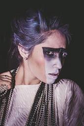 Keywords: model girl dress view beauty dark background fashion style jacket female emotions long hair photoshoot table hairstyle hair posture sitting cosmetics hands person