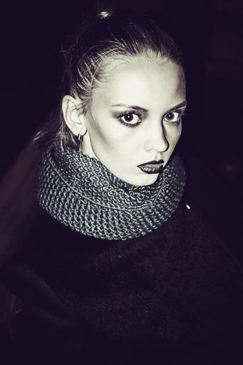 Keywords: model girl dress view beauty dark background fashion style jacket female emotions long hair photoshoot table hairstyle hair posture sitting cosmetics hands person scarf
