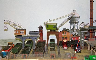Keywords: model layout model cranes dock cranes coal yard bunkers coal loading vintage industrial model chimney gantry