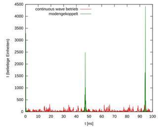 | Keywords: Modenkopplung.svg en Picture for mode-locking of laser modes The intensity square of amplitude of 75 Oszillators with random phase and frequency in a narrow band of 1 Hz and center frequency of 10 14 Hz over a time of several ns is shown in red In green the amplitude of every single oszillator is modulated by a lower frequency 10 GHz and all oszillators are in phase de Bild zum Verständnis von Modenkopplung bei Lasern In rot ist die Intensität von 75 Oszillatoren mit zufälligem Phasenbezug gezeigt Die Osz haben die Mittenfrequenz 10 14 Hz und die Bandbreite 1 Hz In grün schwingen die gleichen Oszillatoren in Phase und ihre Amplitude ist mit 10 GHz moduliert own Svebert 2012-01-30 Lasers Mode locking Cc-zero |