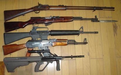 Keywords: Modern-Rifles.JPG Snider-Enfield SKS M16A2 Type 56 AUG Own Amenhtp 2009-05-16 none Snider-Enfield rifle SKS Type 56 rifle M16 rifle Steyr AUG SKS Bayonets