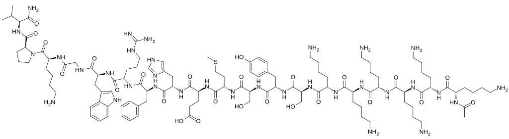Keywords: Modimelanotide.svg Chemical structure of Modimelanotide Own 01 30 17 July 2015 UTC Ed Edgar181 Peptides