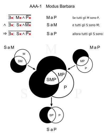 | Keywords: Modus Barbara IT.svg sillogismi La deduzione è rappresentata da un Diagramma di Eulero-Venn a tre cerchi <br>Le premesse e le conseguenze logiche sono rappresentate da diagrammi di Eulero-Venn a due cerchi La circonferenza a sinistra sta per S quella centrale per M e quella a destra per P <br>Nelle aree nere non è presente alcun elemento nelle aree rosse è presente almeno un elemento rappresentato da una <font color red>x</font> Modus_Barbara svg 2010-05-23 13 07 UTC Modus_Barbara svg mate2code derivative work Broc <span class signature-talk >talk</span> validSVG Created with Inkscape Tradotto in italiano Broc Modus_Barbara svg Uploaded with derivativeFX Syllogism charts with all Venn diagrams |