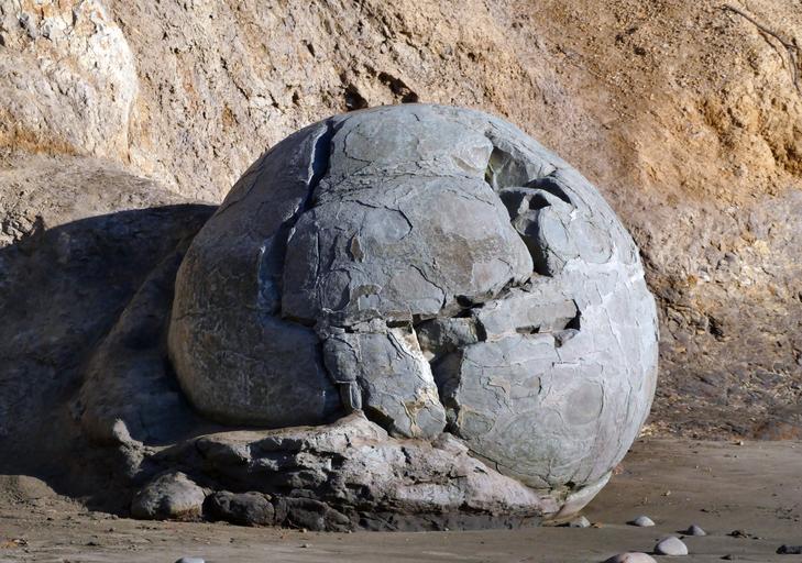 | Keywords: rocks concretions moeraki boulders moerakiboulders public domain dedication (cc0) publicdomaindedicationcc0 geo tagged geotagged free photos freephotos outdoor A concretion is a hard, compact mass of matter formed by the precipitation of mineral cement within the spaces between particles, and is found in sedimentary rock or soil. Concretions are often ovoid or spherical in shape, although irregular shapes also occur. The Moeraki Boulders are unusually large and spherical boulders lying along a stretch of Koekohe Beach on the wave-cut Otago coast of New Zealand between Moeraki and Hampden. They occur scattered either as isolated or clusters of boulders within a stretch of beach where they have been protected in a scientific reserve. The erosion by wave action of mudstone, comprising local bedrock and landslides, frequently exposes embedded isolated boulders. These boulders are grey-colored septarian concretions, which have been exhumed from the mudstone enclosing them and concentrated on the beach by coastal erosion. A concretion is a hard, compact mass of matter formed by the precipitation of mineral cement within the spaces between particles, and is found in sedimentary rock or soil. Concretions are often ovoid or spherical in shape, although irregular shapes also occur. The Moeraki Boulders are unusually large and spherical boulders lying along a stretch of Koekohe Beach on the wave-cut Otago coast of New Zealand between Moeraki and Hampden. They occur scattered either as isolated or clusters of boulders within a stretch of beach where they have been protected in a scientific reserve. The erosion by wave action of mudstone, comprising local bedrock and landslides, frequently exposes embedded isolated boulders. These boulders are grey-colored septarian concretions, which have been exhumed from the mudstone enclosing them and concentrated on the beach by coastal erosion.  |