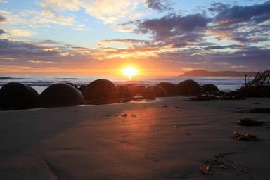 | Keywords: outdoor seaside shore landscape beach sunset sky dusk The Moeraki Boulders are unusually large and spherical boulders lying along a stretch of Koekohe Beach on the wave-cut Otago coast of New Zealand between Moeraki and Hampden. They occur scattered either as isolated or clusters of boulders within a stretch of beach where they have been protected in a scientific reserve. The erosion by wave action of mudstone, comprising local bedrock and landslides, frequently exposes embedded isolated boulders. These boulders are grey-colored septarian concretions, which have been exhumed from the mudstone enclosing them and concentrated on the beach by coastal erosion. en.wikipedia.org/wiki/Moeraki_Boulders en.wikipedia.org/wiki/Sunrise The Moeraki Boulders are unusually large and spherical boulders lying along a stretch of Koekohe Beach on the wave-cut Otago coast of New Zealand between Moeraki and Hampden. They occur scattered either as isolated or clusters of boulders within a stretch of beach where they have been protected in a scientific reserve. The erosion by wave action of mudstone, comprising local bedrock and landslides, frequently exposes embedded isolated boulders. These boulders are grey-colored septarian concretions, which have been exhumed from the mudstone enclosing them and concentrated on the beach by coastal erosion. en.wikipedia.org/wiki/Moeraki_Boulders en.wikipedia.org/wiki/Sunrise |