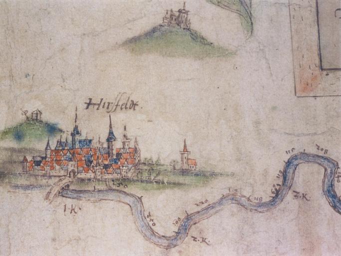 Keywords: Moers-fuda-stromkarte1.jpg de Erster Abschnitt aus der historischen Karte Fulda-Stromkarte von Joist Moers um 1597 angefertigt Zu sehen ist Hersfeld mit der alten Fuldabrücke und des angedeuteten Zuflusses des Geisbaches im Vordergrund Rechts daneben ist die auf freiem Feld in der Fuldaaue stehende Klauskirche eingezeichnet Links über der Stadt ist der Galgenplatz mit Galgen und dem Richtrad angedeutet lag auf einer Anhöhe des Tageberges heute vermutlich in der Straße Am Hainberg Rechts über der Stadt ist der Frauenberg mit dem dort befindlichen Koster angedeutet en First part of the historic map Fulda-Stromkarte from Joist Moers drawn around 1597 Is's shows the town Hersfeld today Bad Hersfeld the old bridge over the river Fulda the church Klauskirche outside of the defensive wall from Hersfeld the Breaking wheel and gallows the hill Frauenberg with its monastery scaned 1597 Joist Moers ca 1540 “1625 PD-old-100 PD-old-100 Joist Moers Old maps of Hersfeld Maps made in the 16th century Breaking wheels |