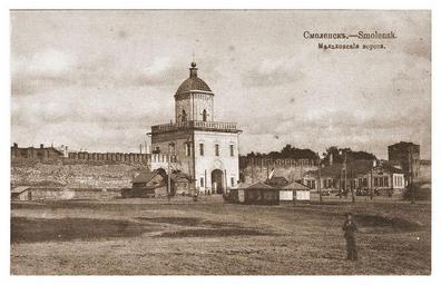| Keywords: Molohovskie gate 5.jpg en View on Molohovskie gate now do not exist from the current Victory Square Right - Moss Tower preserved to this day ru Вид на олоховские во ота ныне не существуют со сто оны нынешней площади Победы Сп ава - оховая башня сох анилась до наших дней О игинальная отк ытка е установлены before 1917 года PD-RusEmpire 20th-century postcards Postcards of Smolensk Molohovskie gate | ||||