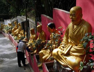 | Keywords: hong kong hongkong sha tin shatin buddahas temple sony dslr-a300 sonydslra300 public domain publicdomain free photos freephotos High above a lush hillside in the New Territories town of Sha Tin, the Monastery of Ten Thousand Buddhas is one of the most dramatic sacred sites in Hong Kong. I managed to visit the monastery before the start of my conference, taking Hong Kong's commuter rail halfway to the border with mainland China. To reach the monastery you must first climb over 400 steps up the hillside, the path lined with lifesize statues of Buddhas of all shapes and sizes. The payoff is well worth the climb - the monastery itself contains a beautiful giant pagoda and a temple with more than 13,000 small buddha statues lining the walls. High above a lush hillside in the New Territories town of Sha Tin, the Monastery of Ten Thousand Buddhas is one of the most dramatic sacred sites in Hong Kong. I managed to visit the monastery before the start of my conference, taking Hong Kong's commuter rail halfway to the border with mainland China. To reach the monastery you must first climb over 400 steps up the hillside, the path lined with lifesize statues of Buddhas of all shapes and sizes. The payoff is well worth the climb - the monastery itself contains a beautiful giant pagoda and a temple with more than 13,000 small buddha statues lining the walls. |