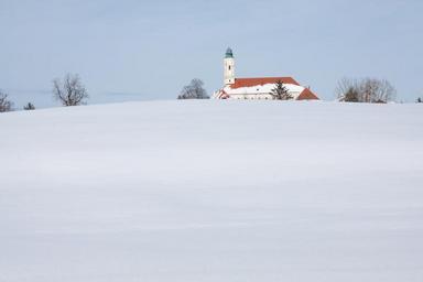 Keywords: monastery church baroque trees sky blue snow white sunny wintry hill upper bavaria