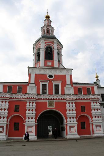Keywords: monastery historic religion russian orthodox arch entrance spire pillars bell tower red clouds sky