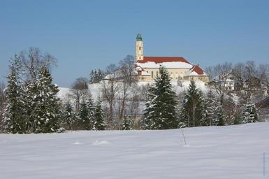 Keywords: monastery reutberg winter snow landscape wintry cold nature snow landscape snowy church baroque steeple firs sky blue sunny upper bavaria