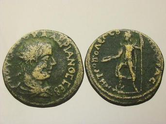 | Keywords: Moneta Ancyry (Walerian I).jpeg Ankyra coin of Valerian I obv rev with Mên as the patron deity of the city holding patera and sceptre foot on bucranium bull's skull own 2014-01-30 Cyborian użytkownik Greek imperial coins Coins of Valerianus I |