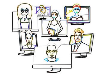 Keywords: monitor computer screen silhouettes network arrow group group work together cohesion teamwork cooperation man woman personal group of people networking internet human data processing community communication
