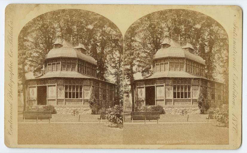 Keywords: stereographs philadelphia zoological garden zoologicalgarden zoological society zoologicalsociety zoos monkey house monkeyhouse monkeys centennial photographic co. centennialphotographicco View of the Monkey House at the Zoological Garden in Fairmount Park, Philadelphia, 1876. Whimsical trim, shingles and siding adorn the house. Benches face the building and the trees which shade it, while a pathway traverses the lawn in front of the house. Accession number: P.2011.47.1613 View of the Monkey House at the Zoological Garden in Fairmount Park, Philadelphia, 1876. Whimsical trim, shingles and siding adorn the house. Benches face the building and the trees which shade it, while a pathway traverses the lawn in front of the house. Accession number: P.2011.47.1613 |