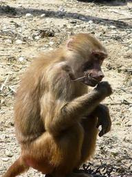 Keywords: monkey sitting food brown side view