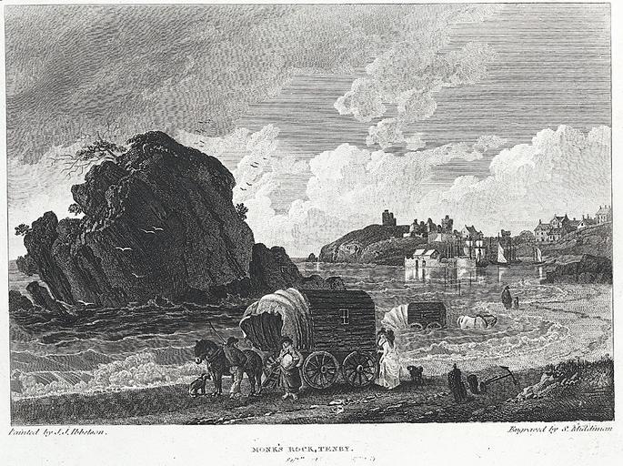 | Keywords: Monk's Rock, Tenby.jpeg  Abstract A view of north beach Tenby showing horse-drawn bathing huts with canopies Size mm 198 183 exhibition history Institution National Library of Wales Technique print engraving bw object history object type PD-old-100-1923 place of creation place of discovery 1128923 Monk's Rock Tenby Uploaded with GWToolset Monk's Rock Tenby http //dams llgc org uk/behaviour/llgc-id 1128923/fedora-bdef image/reference Images uploaded as part of NLW - WMUK collaboration Welsh Landscape Collection Tenby 1810s Beaches Bathing structures Horses |