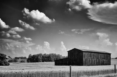 Keywords: monochrome black and white country rural barn field clouds farm landscape countryside outdoor grass meadow farmland tree scenic wheat