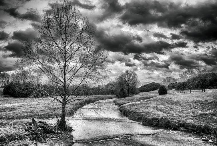 Keywords: monochrome black and white scenery landscape classic country rural scenic farm fence sky stream creek branch river water trees woods