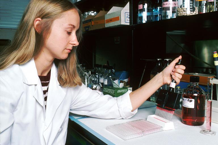 Keywords: Monoclonal antibodies (1).jpg A Caucasian female laboratory technician filling wells with a liquid for a research test This researcher is involved in preparation of cultures in which hybrids are grown in large quantities to produce a desired antibody This is effected by fusing myeloma cell and mouse b-lymphocyte to form hybrid cell hybridoma Topics/Categories People -- Adult People -- Health Professional Science and Technology -- Laboratory Techniques/Equipment Type Color Photo Source National Cancer Institute Linda Bartlett Photographer 2012 1980 Reuse Restrictions None - This image is in the public domain and can be freely reused Please credit the source and/or author listed above Linda Bartlett Photographer PD-USGov-HHS-NIH Media from National Cancer Institute Visuals Online Images uploaded by Fæ Monoclonal antibodies People with lab coats People using pipettes