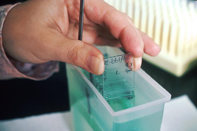 Keywords: Monoclonal antibodies (7).jpg The hand of a laboratory technician bathing some prepared slides in a solution This technician is involved in the preparation of slides of monoclonal antibodies for researchers These highly specific cells are those labeling human breast cancer Topics/Categories Science and Technology -- Laboratory Techniques/Equipment Type Color Photo Source National Cancer Institute Linda Bartlett Photographer 2014 1980 Reuse Restrictions None - This image is in the public domain and can be freely reused Please credit the source and/or author listed above Linda Bartlett Photographer PD-USGov-HHS-NIH Media from National Cancer Institute Visuals Online Images uploaded by Fæ Monoclonal antibodies |