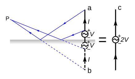 | Keywords: Monopole and image antenna.svg monopole antenna has the same radiation pattern as a dipole antenna with twice the radiated power When a monopole antenna a is mounted over a perfectly conducting ground plane such as the Earth the radio waves can reach a given point P by two paths either propagating directly in a straight line to P or reaching P after first reflecting from the plane <font color blue > blue </font> it has the same radiation pattern as it would if the ground plane were replaced with a virtual image antenna b located under the ground The monopole and its image together are equivalent to a dipole antenna driven with a voltage twice as large as the monopole's 2V but with the same element currents as the monopole So the gain of the monopole will be twice that of the dipole own Chetvorno 2013-05-07 Cc-zero Uncategorized 2013 May 8 |