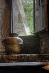 Keywords: mont saint michel france normandy abbey castle island travel gothic french history attraction town window bench old historic jug pitcher tin metal