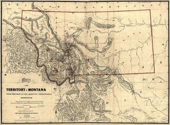| Keywords: MontanaDeLacy1865.jpg en Map of the territory of Montana with portions of the adjoining territories showing the gulch or placer diggings actually worked and districts where quartz gold silver lodges have been discovered to January 1st 1865 / drawn by W W de Lacy for the use of the first legislature of Montana LOC-map g4251h ct001858 W W deLacy 1865 PD-USGov Maps of Montana |