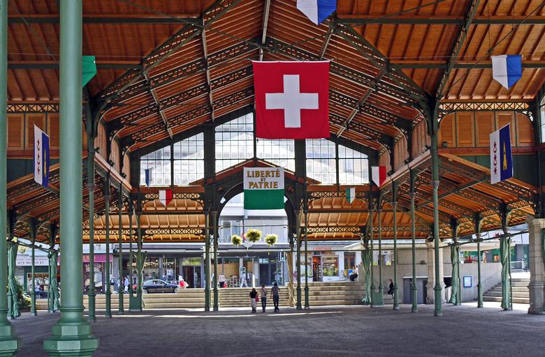 Keywords: montreux market hall event hall flags vaud lake geneva lac léman pillar roof switzerland carrier festival steel structure steel beams building lake promenade national pride canton flags