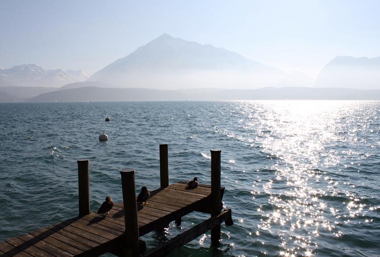 Keywords: mood lake thun switzerland mountains water feature water web anlegstelle landscape bridge nature wood berner bernese oberland alpine sky scenic distant view weather beautiful leisure more vision view haze fog overview lake thun waters