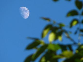 Keywords: moon half moon sky blue sky tree bough colors blue green spring