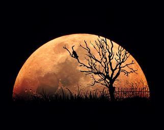 Keywords: moon moon night full moon romance mysticism mystical moon craters night sky shilouette gloomy dark tree cat animal grasses landscape mysterious mood creepy gnarled aesthetic fence crotch weird surreal atmosphere scene
