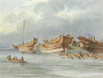 | Keywords: Moored boats from Arakan or Chittagong.jpg Watercolour by Thomas Prinsep 1800-1830 of moored boats from Arakan or Chittagong dated c 1828 The image is inscribed on the album page 'Mugh boats' Mugh is the name commonly applied to natives of Arakan or Chittagong Thomas Prinsep came from a family who served in India for three generations; five of his brothers were also in the country Thomas was in charge of the surveying of the Sunderbunds; a large area of fresh and saltwater mangrove swamp in Bengal covering sixty to eighty miles and consisting of flat marshy islands covered with dense forests inhabited by crocodiles and forming the final retreat of the Bengal Tiger He made a detailed survey of the area and his maps of the 24 Parganas District formed part of the Hodges map of the Sunderbunds published in 1831 The limits of the Sunderbunds forest is known as 'The Princeps Line' Thomas was sent to Chittagong in 1826 http //www bl uk/onlinegallery/onlineex/apac/other/largeimage68389 html British Library website Thomas Prinsep 1800-1830 PD-old-100 Port of Chittagong 1828 paintings Watercolor paintings of landscapes Paintings of ships Rakhine State Paintings of ports and harbours Old vintage photographs of Bangladesh |