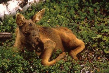 Keywords: moose calf young animal mammal wildlife plants grass nature outside resting beautiful forest woods macro close-up