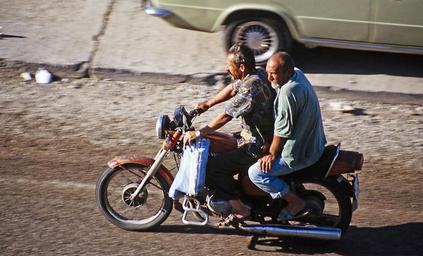 Keywords: moped two wheeled vehicle men drive motorcycle bikes exhaust old