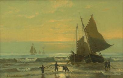 | Keywords: Moran Fishing Boats at Sunset.jpg Fishing Boats at Sunset Oil on canvas 16 x 24 inches http //www treadwaygallery com/ONLINECATALOGS/December2005/catalog/0501-0600 html ca 1870 Edward Moran PD PD-Art Fishing boats in art Waves in art Edward Moran Paintings of seascapes with sunset Sailboats at sunset |