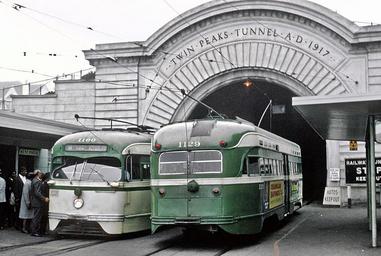 | Keywords: san francisco sanfrancisco san francisco sanfrancisco 1160, a M OCEAN VIEW BROAD TO PLYMOUTH and 1129, a M OCEAN VIEW WEST PORTAL at the West Portal of Twin Peaks Tunnel in San Francisco, CA on August 24, 1967. Look at the poles on 1129. I'm guessing, given what Roger said the roll sign read, it is about to be wyed. 1160, a M OCEAN VIEW BROAD TO PLYMOUTH and 1129, a M OCEAN VIEW WEST PORTAL at the West Portal of Twin Peaks Tunnel in San Francisco, CA on August 24, 1967. Look at the poles on 1129. I'm guessing, given what Roger said the roll sign read, it is about to be wyed. The other day I posted the middle photo in this 3-photo sequence. I said I thought Car 1129 was about to be wyed at West Portal because of what Roger Puta said the roll sign read. Yesterday I found the other two slides in the sequence. This is PCC 1129, a M OCEAN VIEW WEST PORTAL short turn car at the West Portal (West Portal Ave and Ulloa St). in San Francisco, CA on taken by Roger Puta on August 24, 1967. Ulloa Street is perpendicular to West Portal Ave. a couple of hundred feet west from the actual portal. Ulloa is what the L TARAVAL cars use to get over to Taraval. 1. 1129 on West Portal Ave. approaching the West Portal Station. 2. 1129 in the West Portal Station. Roger caught her with her front pole up and rear pole down ready to back on to Ulloa St. 3. 1129 backing onto Ulloa still with her front pole up and rear pole down. Next she will turn west on West Portal Ave. Questions: Will she then back into West Portal station to pick up passengers (which makes sense) or will she just head out West Portal Ave.? Did the short-turn cars make slightly different moves in the a.m. when most passengers were inbound than in the p.m. when most passengers were outbound? When heading west, what did 1129's roll sign say? I have stood and watched the action at West Portal during the afternoon rush when it was all Boeings (no short turns) and it was a pretty busy place. I can't envision a short-turn making wying movements every few minutes. Did the other lines radiating out from West Portal have west-end short turns? I can't remember seeing short turns on the less traveled end of a streetcar line in any city. So you MUNI historians please help me understand this. The other day I posted the middle photo in this 3-photo sequence. I said I thought Car 1129 was about to be wyed at West Portal because of what Roger Puta said the roll sign read. Yesterday I found the other two slides in the sequence. This is PCC 1129, a M OCEAN VIEW WEST PORTAL short turn car at the West Portal (West Portal Ave and Ulloa St). in San Francisco, CA on taken by Roger Puta on August 24, 1967. Ulloa Street is perpendicular to West Portal Ave. a couple of hundred feet west from the actual portal. Ulloa is what the L TARAVAL cars use to get over to Taraval. 1. 1129 on West Portal Ave. approaching the West Portal Station. 2. 1129 in the West Portal Station. Roger caught her with her front pole up and rear pole down ready to back on to Ulloa St. 3. 1129 backing onto Ulloa still with her front pole up and rear pole down. Next she will turn west on West Portal Ave. Questions: Will she then back into West Portal station to pick up passengers (which makes sense) or will she just head out West Portal Ave.? Did the short-turn cars make slightly different moves in the a.m. when most passengers were inbound than in the p.m. when most passengers were outbound? When heading west, what did 1129's roll sign say? I have stood and watched the action at West Portal during the afternoon rush when it was all Boeings (no short turns) and it was a pretty busy place. I can't envision a short-turn making wying movements every few minutes. Did the other lines radiating out from West Portal have west-end short turns? I can't remember seeing short turns on the less traveled end of a streetcar line in any city. So you MUNI historians please help me understand this. |