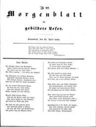 | Keywords: Morgenblatt fuer gebildete Leser 1842 385.jpg Morgenblatt_fuer_gebildete_Leser_1842_ jpg 384 386 Morgenblatt für gebildete Leser Stuttgart und Tübingen Cotta UB Darmstadt Signatur Zs 3042 1842 Annette von Droste-Hülshoff und andere Books by Annette von Droste-Hülshoff Morgenblatt für gebildete Stände PD-old |
