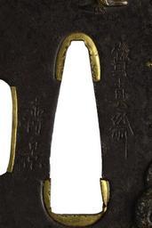 | Keywords: Morikawa Toshikage - Tsuba with Stone Rabbit with a Blossoming Plum Branch - Walters 51371 - Mark A.jpg On the right of this tsuba is a stone rabbit with a branch of plum blossoms in its back Two birds fly over the central opening A stream is shown at the lower left Rabbits are one of the zodiac animals and often depicted in Japanese art On the reverse are a pine branch by a river and a full moon at the upper right 1864 late Edo iron gilt gold silver cm 6 8 accession number 51 371 20775 Henry Walters Baltimore date and mode of acquisition unknown Walters Art Museum Henry Walters Acquired by Henry Walters Signature Hôshinsai/Toshikage; Date Genji ki-no-e ne chûshû/ kao ; Translation Mid-autumn Genji year of the rat 1864 place of origin Edo present-day Tokyo Japan Walters Art Museum license Tosogu Japanese sword fittings in the Walters Art Museum Morikawa Toshikage Media contributed by the Walters Art Museum needs category review |