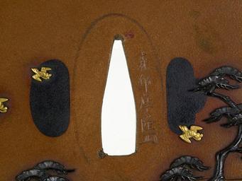 | Keywords: Morimura Atsutaka - Tsuba with Saigyô Gazing at Mt Fuji - Walters 51136 - Mark.jpg Seated at the lower left of the tsuba is the 12th-century monk Saigyô Saigyô was a palace guard who became a Buddhist monk at the age of twenty three when the Emperor Toba abdicated and became a monk Saigyô wandered the country until he died in Kyoto at the age of seventy three Here he is shown gazing at Mt Fuji which is shown on the upper left of the tsuba Saigyô's traveling hat rests beside him The reverse of the tsuba shows pine trees and birds The holes for the utility knife and hair pick are indicated in the background but do not appear to have actually been cut through the tsuba middle Other date century 19 Edo copper shibuichi silver gold shakudo cm 7 65 7 0 48 accession number 51 136 8898 Henry Walters Baltimore date and mode of acquisition unknown Walters Art Museum Henry Walters Acquired by Henry Walters Signature Morimura Atsutaka kao place of origin Edo present-day Tokyo Japan Walters Art Museum license Tosogu Japanese sword fittings in the Walters Art Museum Morimura Atsutaka Media contributed by the Walters Art Museum needs category review |