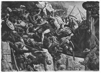 | Keywords: Moritz von Schwind Gottfried von Bouillon erstürmt eine Brücke.jpg Artwork creator Moritz von Schwind Gottfried von Bouillon erstürmt eine Brücke oil canvas 55 x 70 cm object history Besitz S K H Rupprecht von Bayern München ProvenanceEvent burnt self scanned from book Georg Jacob Wolf mit der Glaspalast-Künstlerhilfe München Hrsg Verlorene Meisterwerke Deutscher Romantiker Verlag F Bruckmann AG München 1931 1859 PD-old-100 Other versions Romantic mythological paintings Moritz von Schwind Glaspalast-Katastrophe Godfrey of Bouillon |