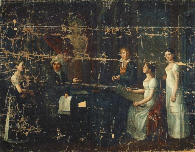 | Keywords: Morkov Family Portrait2.jpg ru 2-й фамильный по т ет кисти В А Т опинина аписан в 1815 году ыне сбе егается в запасниках Т етьяковской гале еи в пов ежденном состоянии Пе сонажи изоб ажены в нату альную величину За столом сидит исуя 3-я дочь И И о кова г афиня Ва ва а за ее спиной стоит внучка гуве нантки m-elle Боцигети сп ава от них стоит т етий сын И И о кова г аф А кадий Слева за столом сидит сама гуве нантка Боцигети а сп ава от нее четве тая дочь И И о кова г афиня а ия 1815 абота взята с https //vk com/club52196838 Creator Vasily Tropinin other versions Т етьяковская галле ея cc-zero Uploaded with UploadWizard 1815 portrait paintings Family portraits by Vasily Tropinin Damaged paintings |