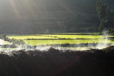 Keywords: morning smokey thatch lightbeam rice field madagascar countryside agriculture rural rice green field landscape farm farming scenery