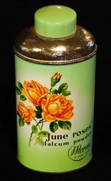 Keywords: Morny June Roses talcum powder tin, pic3.JPG Very old packaging of a Dutch product that is not produced and/or sold any more own 2014-03-14 11 06 23 Alf van Beem CC-zero Trademarked Talcum powder tins