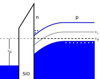 Keywords: MOS band bending.svg en Band bending in an n-channel MOSFET at inversion own Pieter Kuiper 2009-10-27 Created with Text Editor Metal-oxide-semiconductor band diagrams