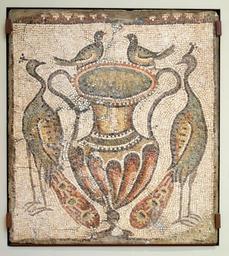 | Keywords: Mosaic of Amphora with Doves on Rim, Flanked by Peacocks, Roman, Homs, Syria, 450-462 AD, polychrome marble tesserae - Chazen Museum of Art - DSC01906.JPG en Exhibit in the Chazen Museum of Art University of Wisconsin-Madison Madison Wisconsin USA This artwork is old enough so that it is in the public domain Photography was permitted in the museum without restriction 2013-07-21 13 09 19 own Daderot cc-zero Ancient Roman art in the Chazen Museum of Art Uploaded with UploadWizard Birds in ancient Roman mosaics |